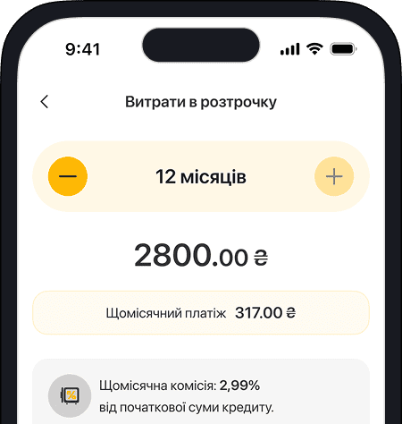 Комісія 2.99% від суми кредиту за кожен місяць користування. Ви платите лише за фактичне користування. Наприклад, якщо погасите кредит за 3 місяці замість 6, то й комісію сплатите лише за 3 місяці.