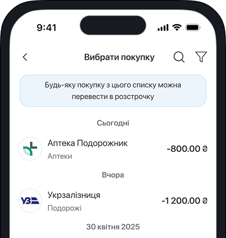 Перейдіть в меню «Кредити» — «Витрати в розстрочку» або виберіть покупку від 500 грн, яку бажаєте перевести в розстрочку, в історії операцій по картці