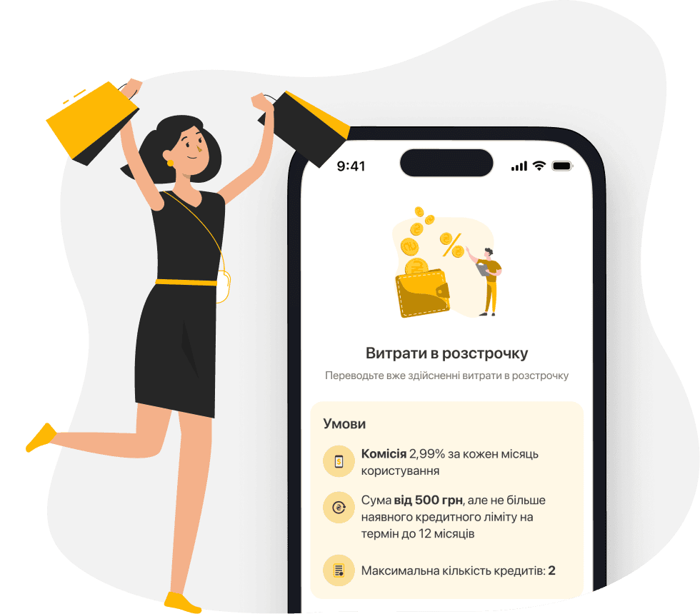 Від 500 до 100 000 грн, у межах вашого ліміту. Перевірити свій ліміт можна у розділі «Кредити». Ліміти розраховуються індивідуально.